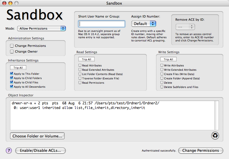 Für die, welche das Terminal lieber aussen vor lassen, gibt es mittlerweile eine Alternative. Sie nennt sich Sandbox. Sandbox bietet eine grafische Oberfläche an, um ACL's und ACE's zu erstellen und zu modifizieren (Abbildung 19.2).